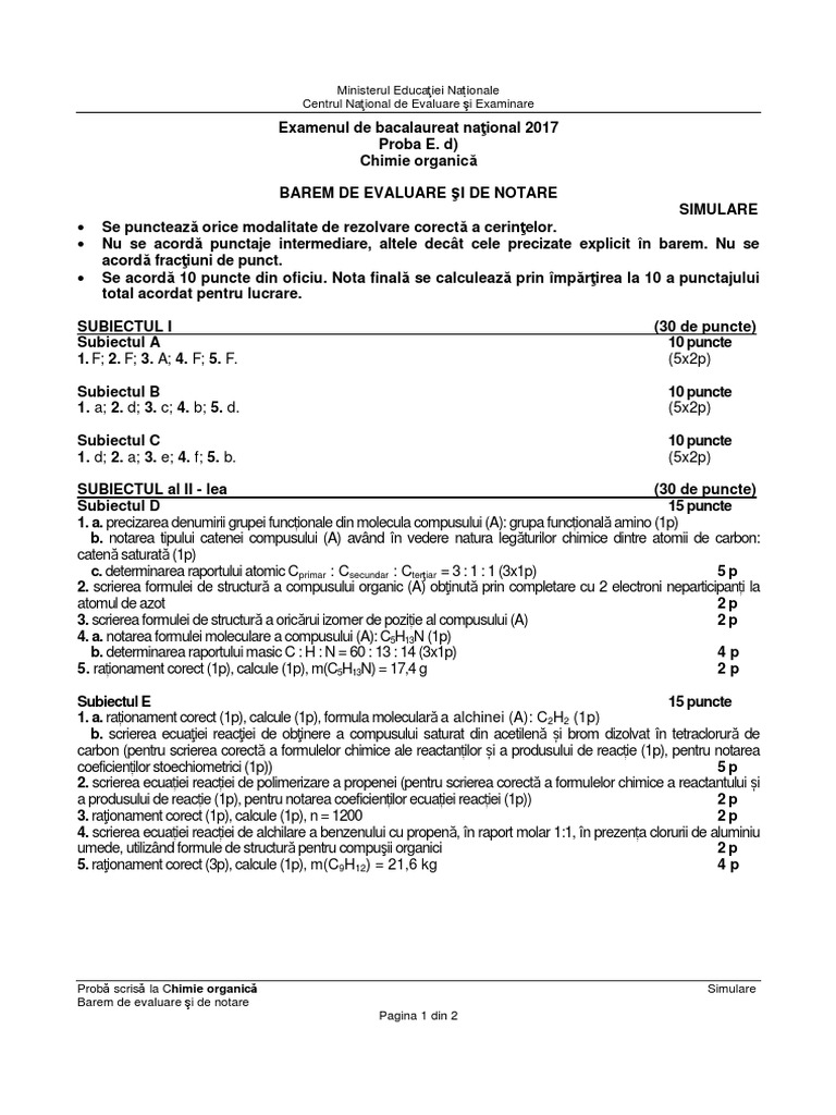 Subiecte și Barem Chimie Organica Bac 2017 Examenul S A Sfarșit Iată Subiectele Live Update