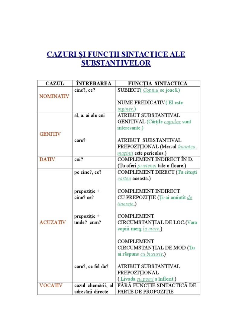 Cazurile Si Functiile Sintactice Ale Substantivului Clasa 7 Tabel