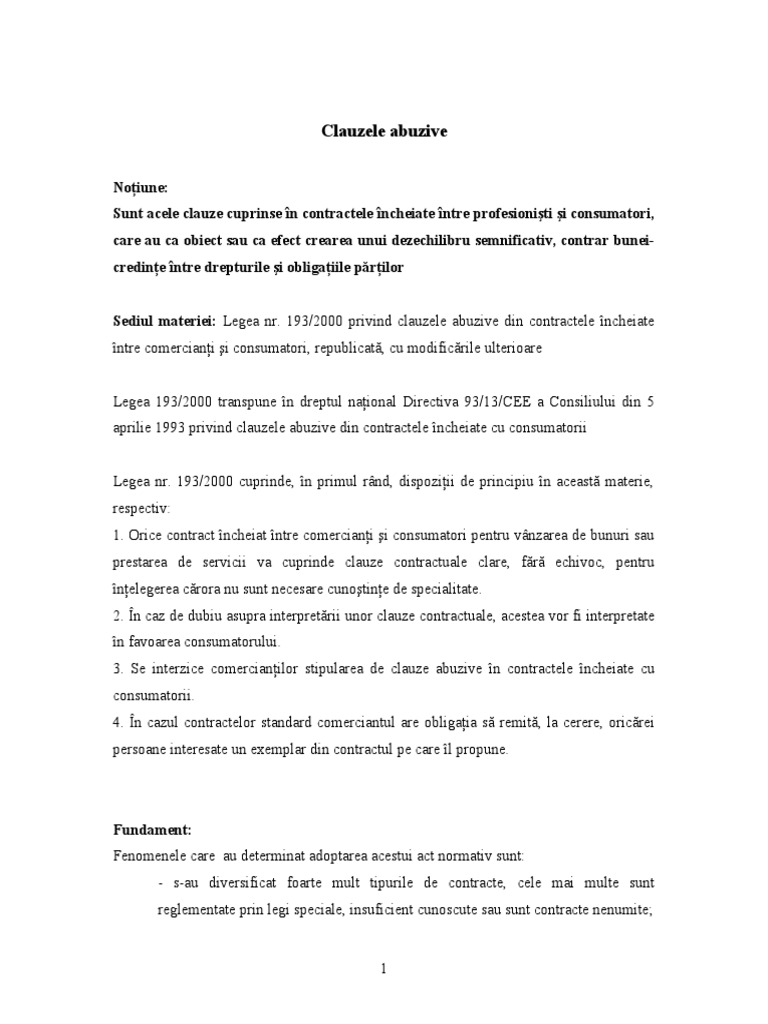 Legea Nr 193 2000 Clauzele Abuzive Din Contractele Incheiate Intre Profesionisti Si Consumatori Republicata La 3 August 2012