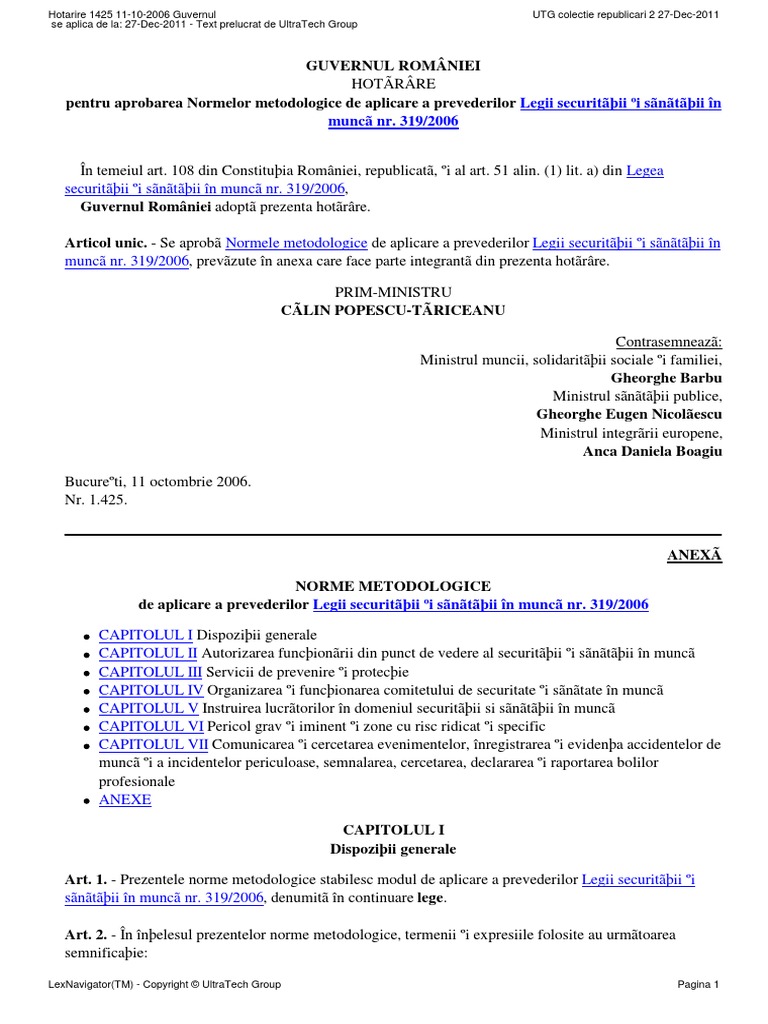 H G Nr 1425 2006 Norme Metodologice De Aplicarea A Legii 319 2006 Actualizata La 4 Noiembrie 2016 Universulcartii Ro